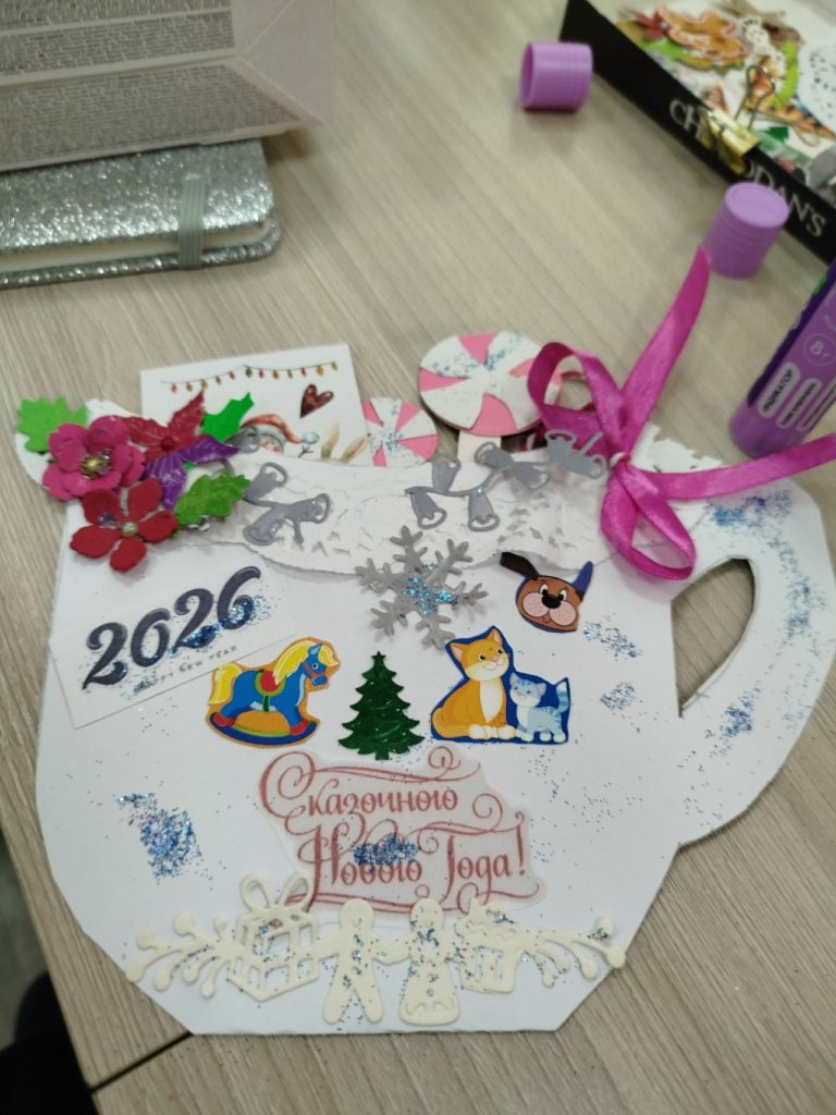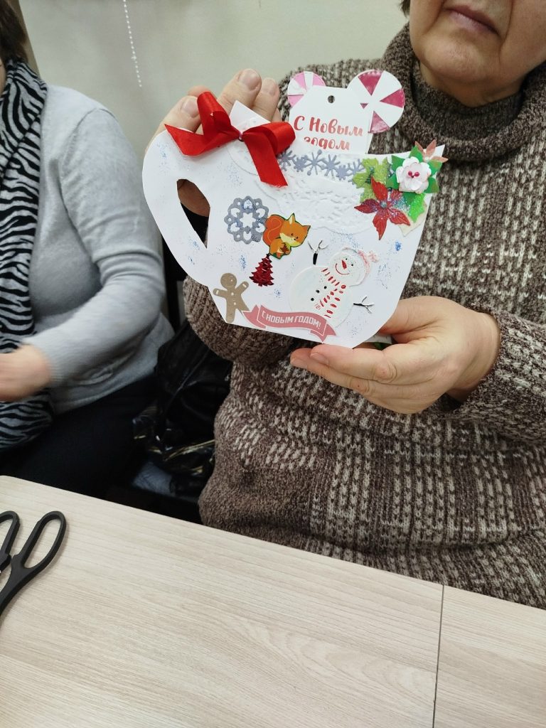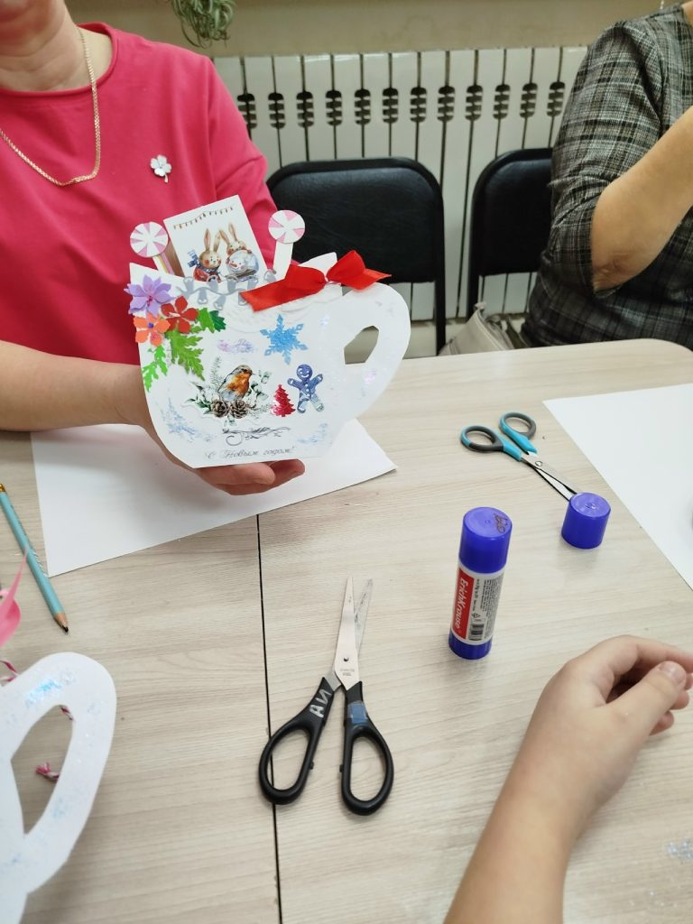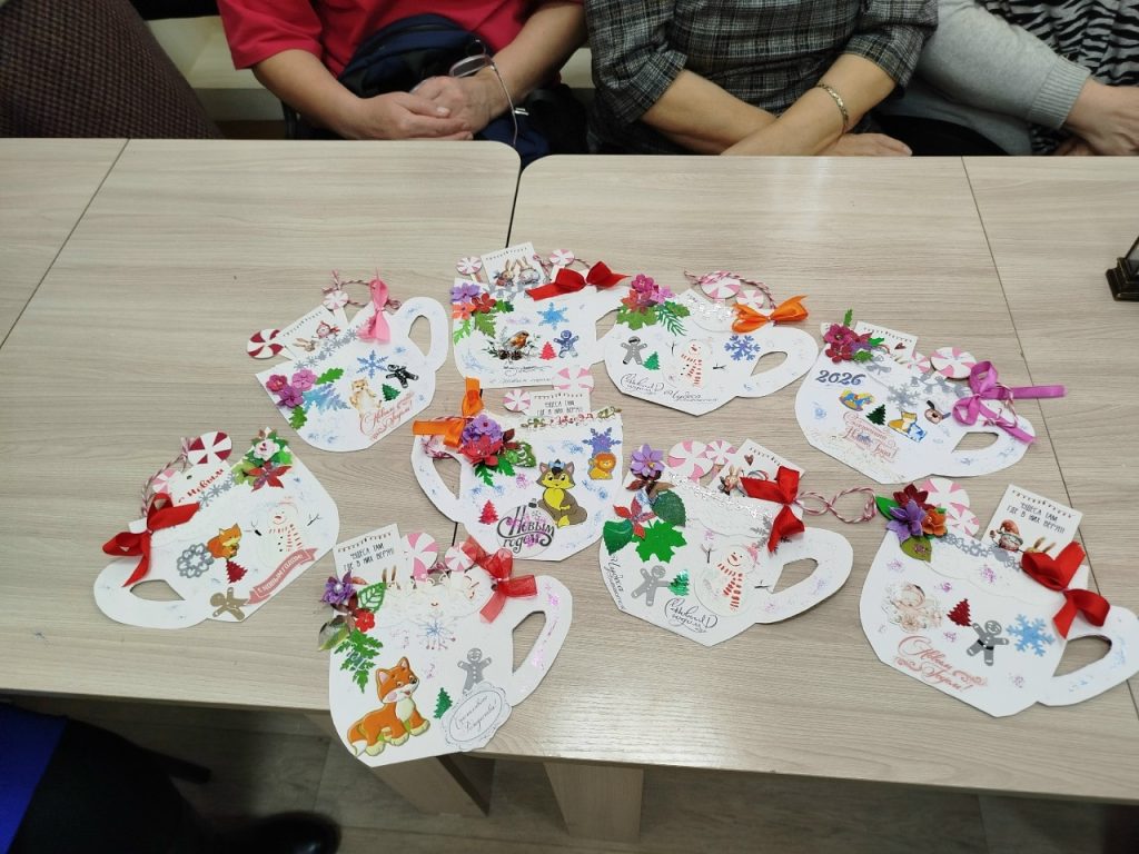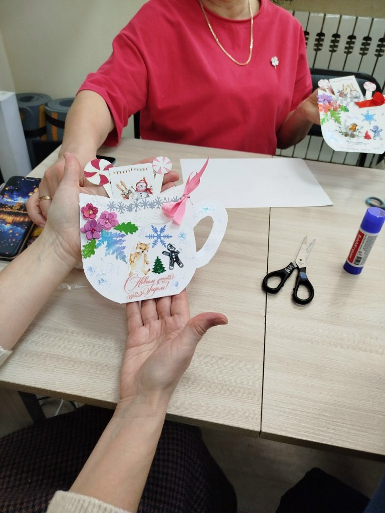 Члены Тюкалинской местной организации ВОИ 18 декабря 2025 года собрались на мастер-классе, где в технике скрапбукинг создавали новогодние открытки-сюрпризы. Открытки были в виде чаши — композиции с поздравительными надписями, ёлочками, снежинками и другими элементами. У каждого участника получилась своя авторская работа — весёлая и красочная, которую можно подарить близким.